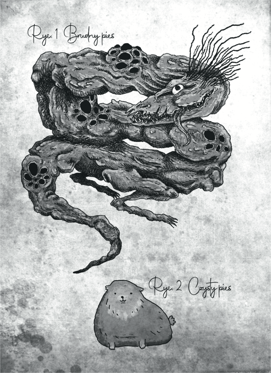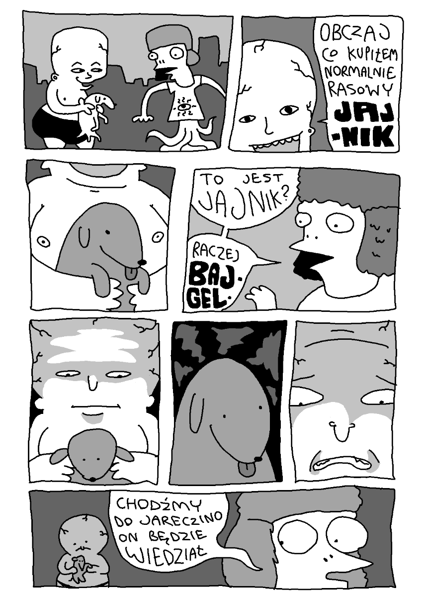 Za pomysłem na antologię stoją Bartłomiej Nahajski i Adrian Waldemar Gajos czyli przedstawiciele nowej, pure nonsensowej i paintowej fali polskiego komiksu. Mógłbym w ciemno przed lekturą założyć, że skoro za sterami stoi ten 'od paintowych patyczaków' to w środku znajdę historie o memicznym wydźwięku. I tak - Wielki atlas mytych psów to przegląd wyobraźni młodych niezalowych twórców plus kilka bardziej rozpoznawalnych nazwisk. A młodzi wyobraźnię mają specyficzną - absurdalną, groteskową, eksperymentalną i często zrywającą z tradycyjnym warsztatem komiksowym.